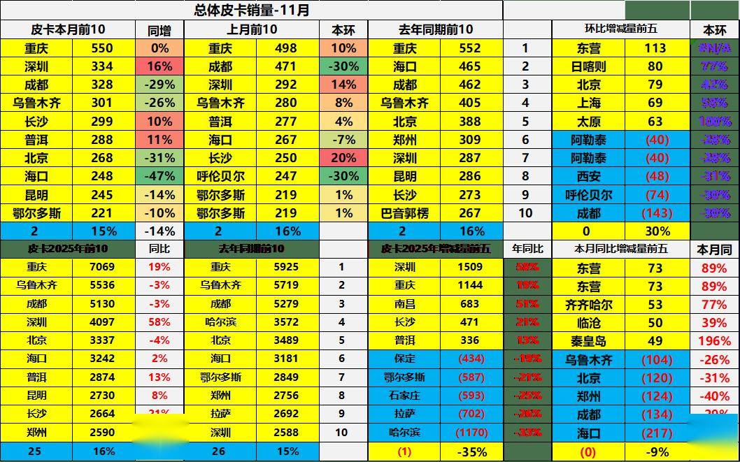 11月全国皮卡主力城市是重庆、成都、深圳等。尤其是随着电动皮卡推出,深圳等东部大城市的新能源皮卡需求表现较强。