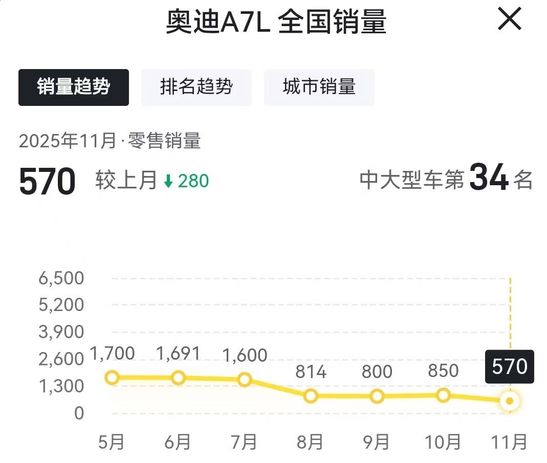一个很可悲的事情,明明长得比奥迪A6L要更符合年轻人审美,开着的操控性和舒适性感受也更好,但最近几个月奥迪A7L的销量数据却仍仅仅只有几百台,这是让我们所万万没有想到的。