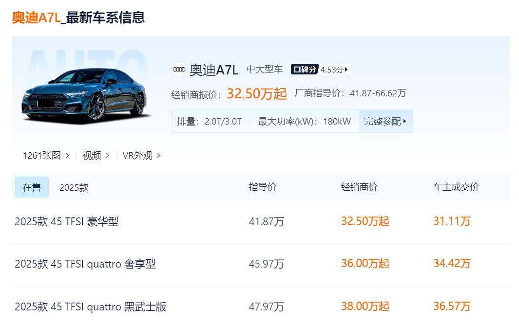 你要说价格,指导价41.87-66.62万元区间的A7L目前在终端已经出现了很大幅度的优惠。单从各主流汽车网站平台上看,奥迪A7L的最低配车型报价就已经来到了32万多。