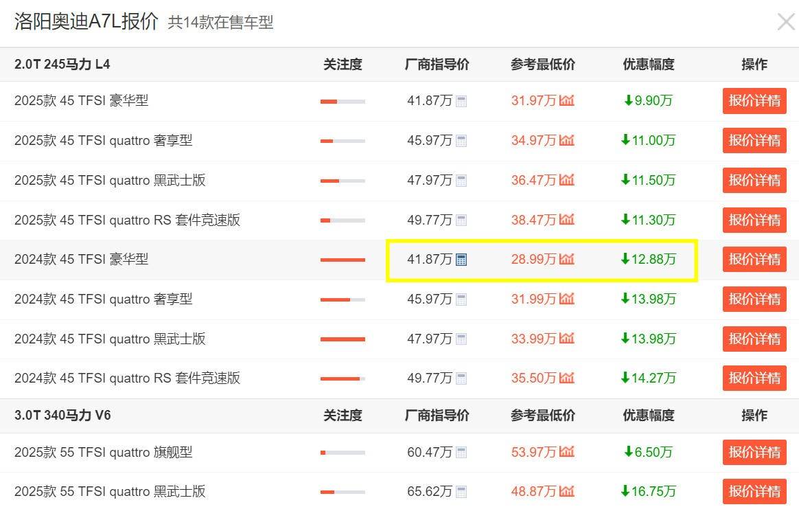 更何况,在部分地区经销商处,2024款的奥迪A7L目前还打出了最低28万多起售的价格行情。因此,奥迪A7L都已经卖这么便宜了,你会想要去买它吗?