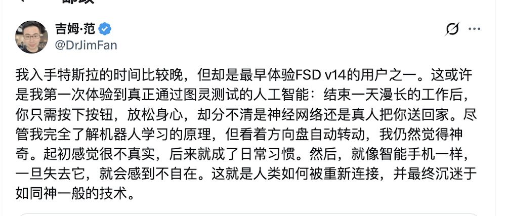 ▲Jim Fan评价FSD V14.2.2