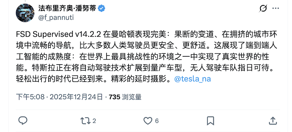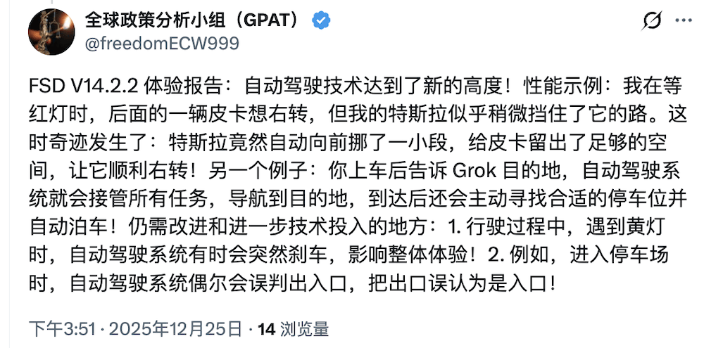 他发文说:“FSD V14是首个通过我所定义‘物理图灵测试’的AI系统。在整个驾驶过程中,我完全无法判断操控车辆的是AI还是人类驾驶员。”