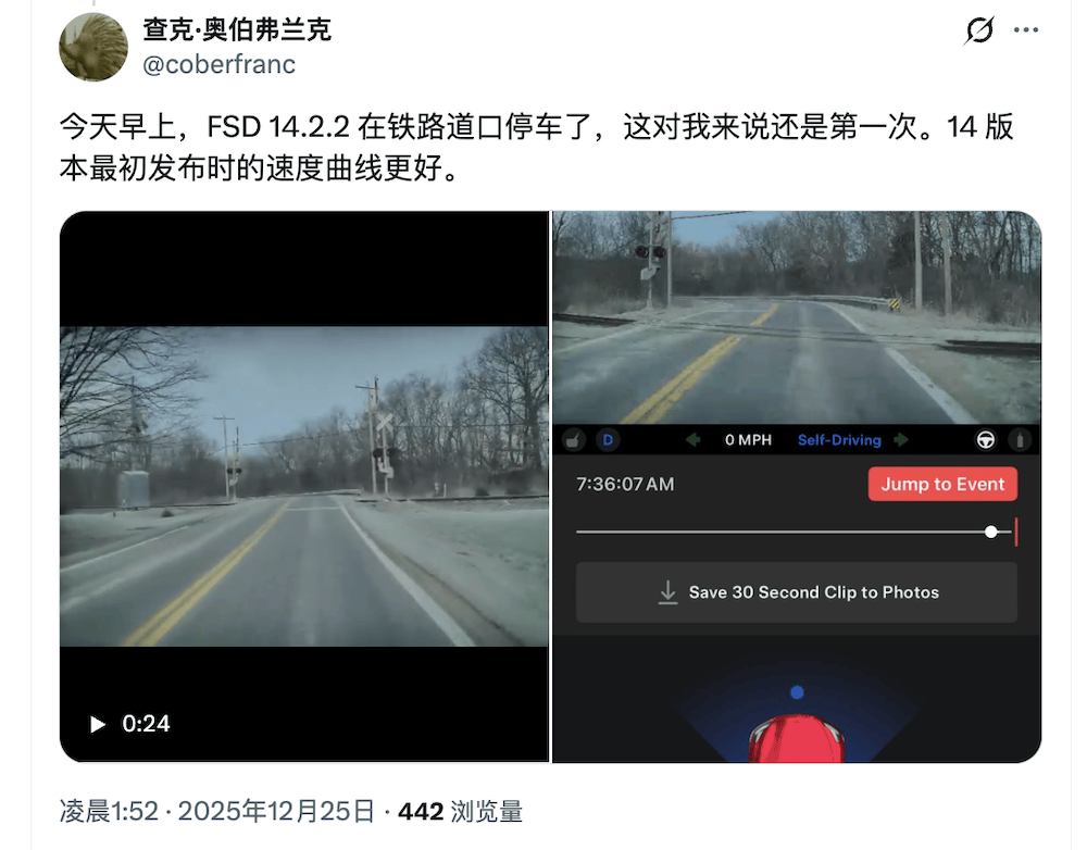 ▲海外网友反馈FSD新版本遇到铁路道口可自动停车