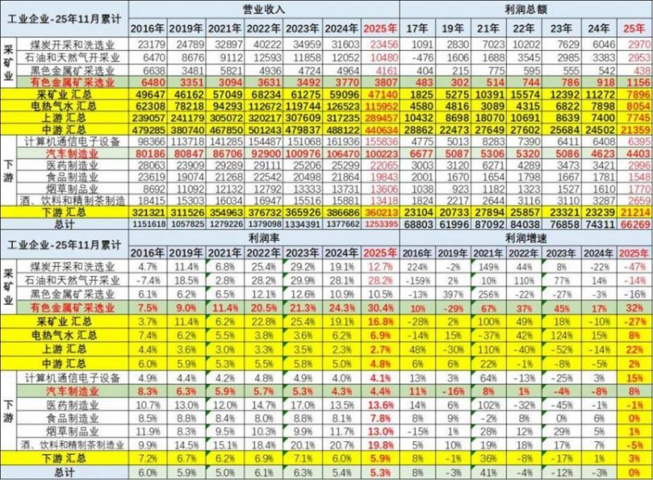 由于“十四五”末的汽车市场表现基本符合预期,今年1-9月增速超强,因此4季度的减速蓄势特征明显。新能源锂电池需求4季度疲软严重,原有的生产计划调减明显,也必然导致上游的2026年初休假减产增多。而新能源上游材料利润极其丰厚,今年1-11月有色矿业利润率达到30%,是汽车行业的7倍。稳定的价格和合理节奏的供需平衡对产业发展很重要,产业链的利润失衡对行业发展也是不利的,期待产业链更顺畅平稳。