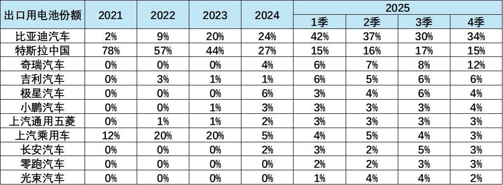 2025年4季度的比亚迪新能源车出口超强,拉动出口用电池增长较大。社会电池供应商的出口整车用电池增长较小。