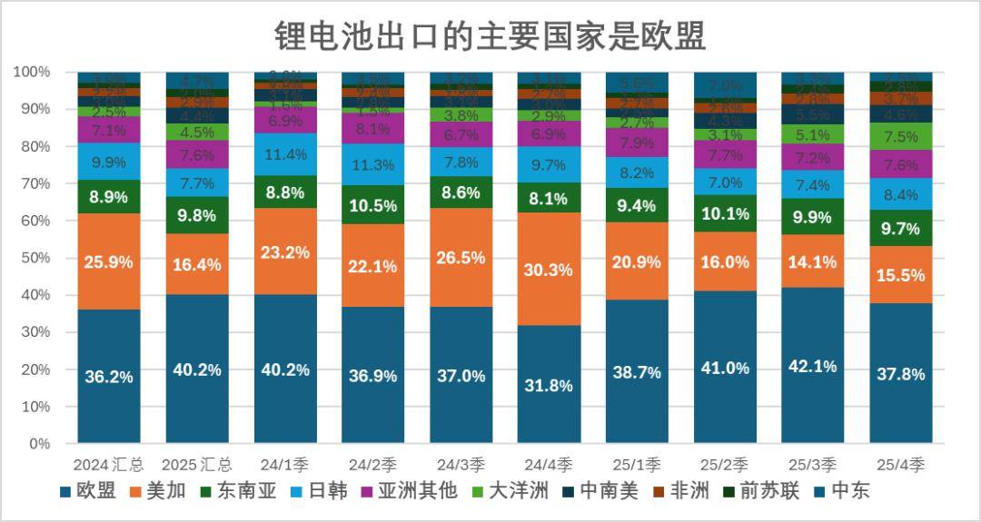 中国锂电池出口的主要市场是欧盟,欧盟的市场需求达到40%左右,2025年比2024年增长4个百分点。