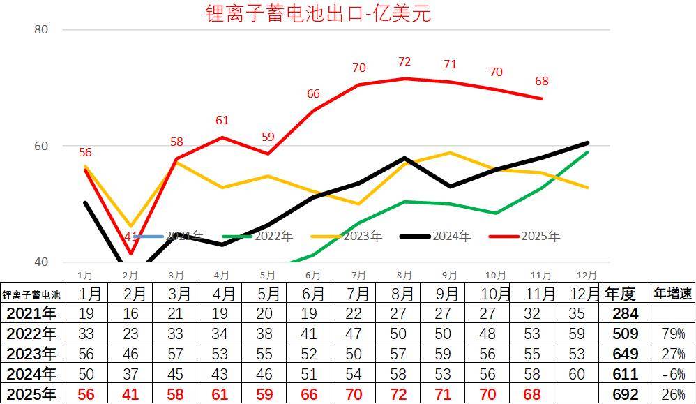 锂电池作为新三样的重要优势产品,出口表现优秀,利润高、市场好。自2020年拜登上台以来,中国出口商品中应该说锂电池的出口表现相对较为优秀。在2021年出口仅有284亿美元,2022年出口509亿美元,2023年出口也达到了649亿美元的超高水平,但是到了2024年就出现了相应的增速放缓的情况。今年的锂离子电池出口基本保持在60亿美元左右的月度的平稳水平,7-10月上升到70亿美元的水平,11月回落到68亿美元,相当于去年的增长放缓。