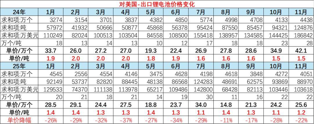 2025年中国大陆对美国锂电池出口总体大幅下滑,从去年的18.7亿美元,下降到今年的10.4亿美元,金额下降45%,而且出口单价也下降22%。这体现了美国的AI带来的电力和储能的暴增,目前尚未与中国出口的锂电池