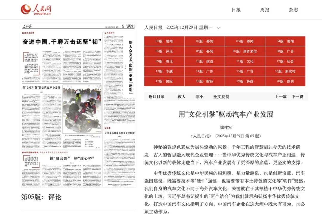 2025年12月29日,长城汽车董事长魏建军的署名文章登上《人民日报》第5版评论版。对于汽车行业而言,这篇文章的刊登具有双重稀见性。其一,这是中国汽车企业家首次以“文化引擎”为核心议题,在《人民日报》发表署名文章;其二,作为制造业企业掌舵人,不聚焦技术成果或市场规模,而以文化建设为核心议题展开论述,在业界并不多见。