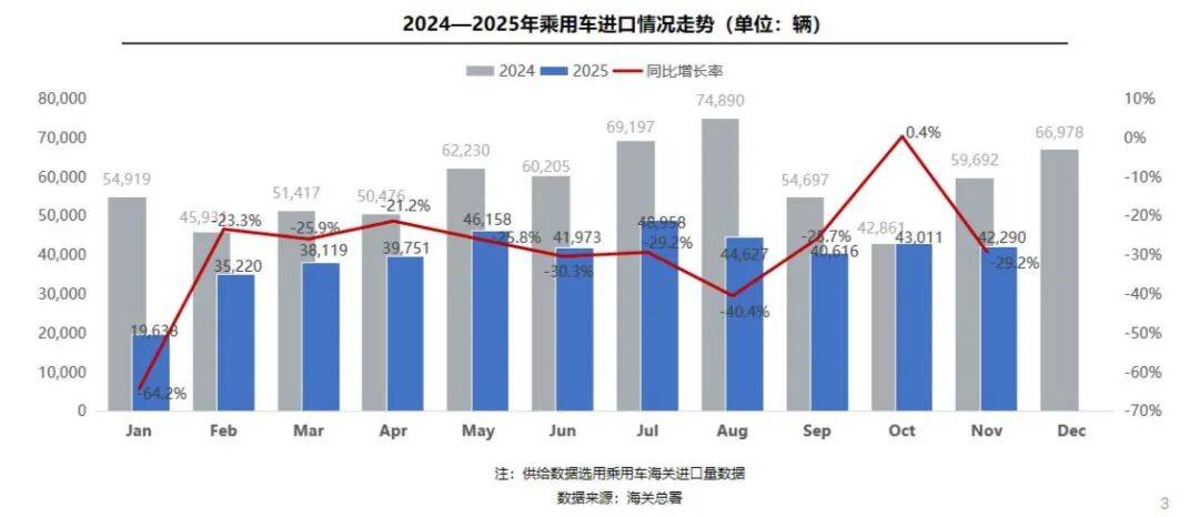 日前,中国汽车流通协会发布的最新中国进口汽车市场月报显示,2025年11月,我国乘用车进口量约4.2万辆(含底盘),同比下滑29.2%,环比下滑1.7%;2025年1至11月,我国乘用车累计进口量约44.0万辆,同比下滑29.7%,进口量已连续四年负增长。