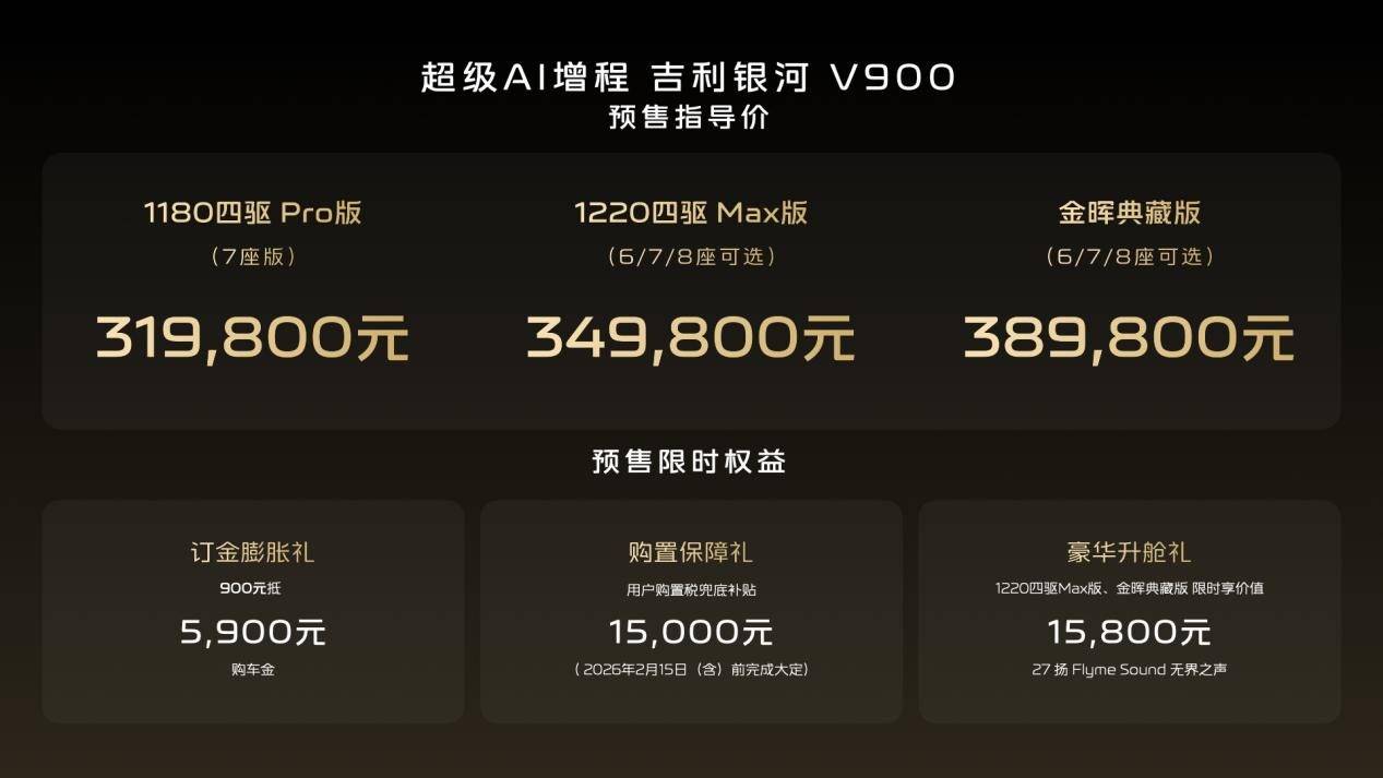 1月7日,吉利银河V900正式开启预售,共计3个版本,预售指导价格区间为31.98万元到38.98万元。
