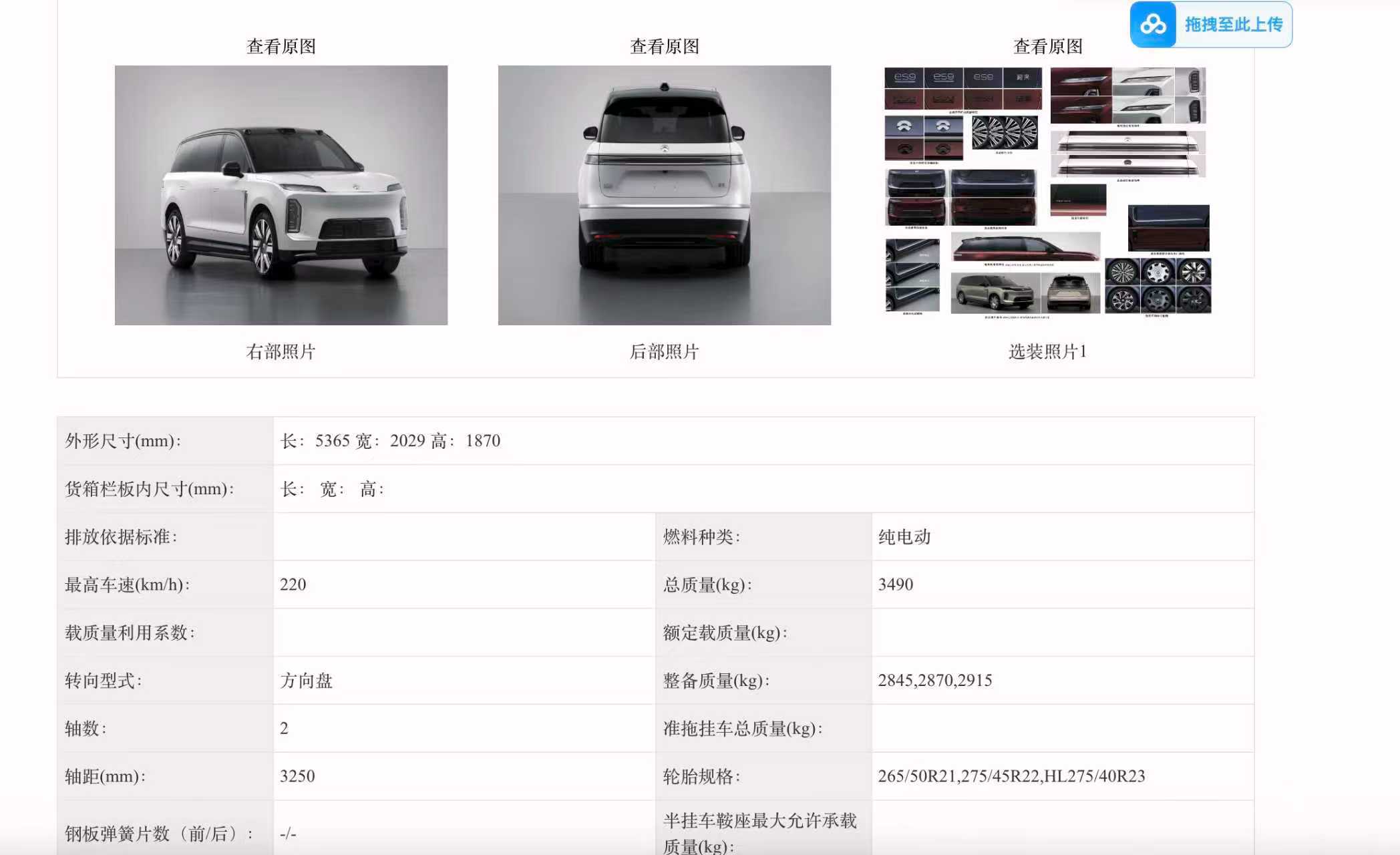 1、 根据官方披露的车身尺寸(长5365 mm宽2029 mm高1870 mm,轴距3250 mm),这是一款体量巨大的全尺寸SUV,之前我们说的大车盛宴中,目前热销的极氪9X,哪怕是去年上市的中国品牌最贵全尺寸新能源SUV仰望U8L,它们都是带油箱的新能源全尺寸SUV,蔚来是第一个把完全只有纯电这一种动力形式的SUV做到这个级别的,也成为全尺寸SUV当中,唯一的纯电玩家。