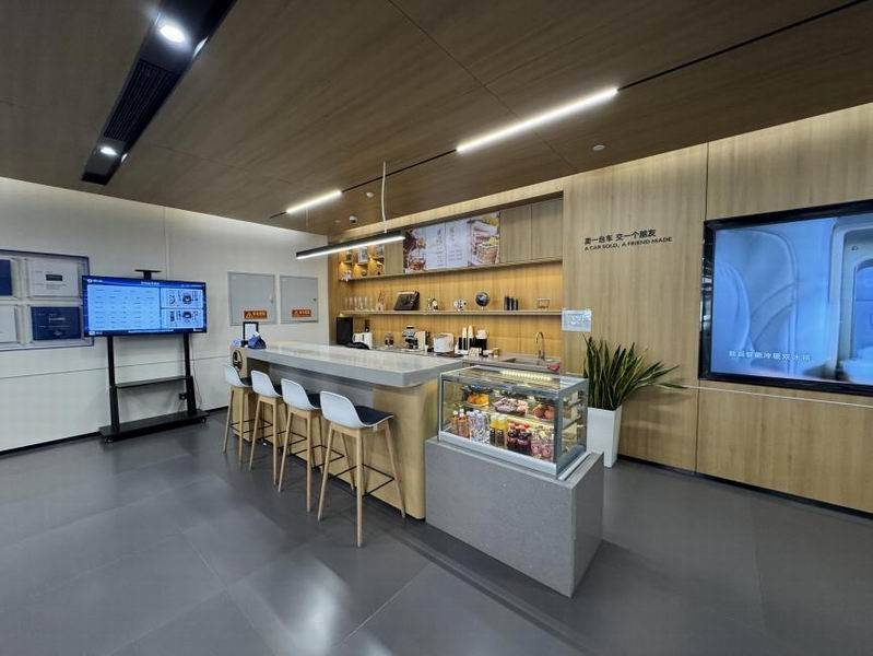 既然体验了售前环节,我便想着也了解一下售后区域的情况。销售很爽快地领我来到餐厅附近的功能区。这里布局集中,一侧是餐饮吧台,饮料茶点均有配备;紧邻着的便是儿童娱乐区,设施丰富且地面墙面都做了软包防护,考虑得很周到。