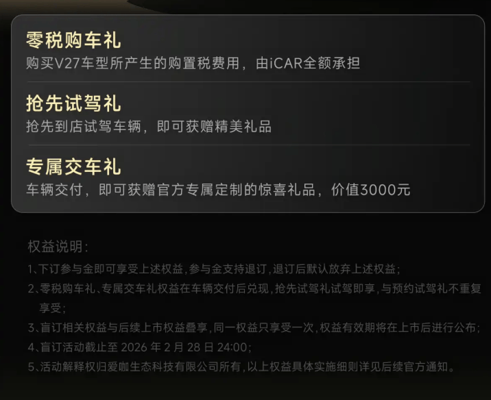 盲订期间,消费者交纳2000元参与金,即可获赠三重大礼,包括:1、购买V27车型所产生的购置税费用,由iCAR承担;2、抢先到店试驾车辆,即可获赠精美礼品;3、车辆交付,即可获赠官方专属定制惊喜礼品,价值3000元。