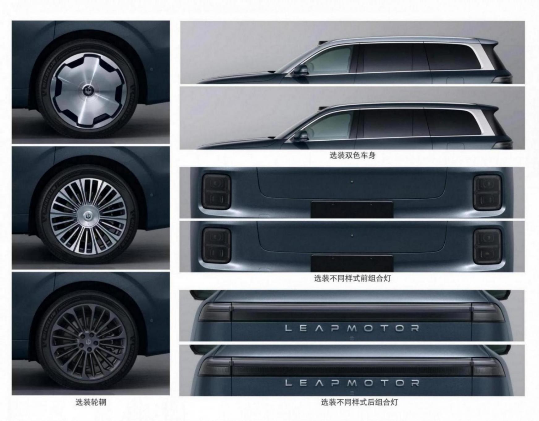 在车身样式上,高配车型“不可避免”地采用双色车身、迈巴赫风格轮毂……虽然落入设计俗套,但用这种“稳妥成熟”的方案来彰显高端的旗舰身份,对于零跑来说是最不会犯错的设计,买大型新能源SUV的高端消费者就是很吃这套“传统设计”。