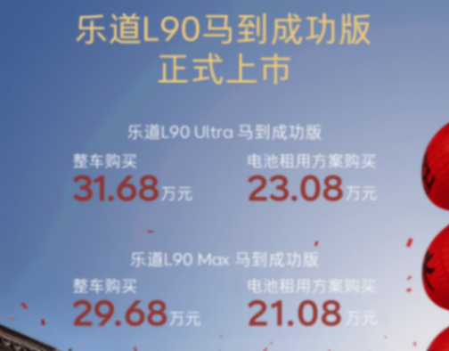 1月23日,乐道L90马到成功版正式上市并陆续到店,新版本基于现有乐道L90 Max和Ultra六座版本打造,标配价值38,470元的「马到成功」专属定制套装,整车购买29.68万元起售,电池租用方案购买21.08万元起售,同时可享至高1.9万元购车权益,新车将于2月1日开启交付。