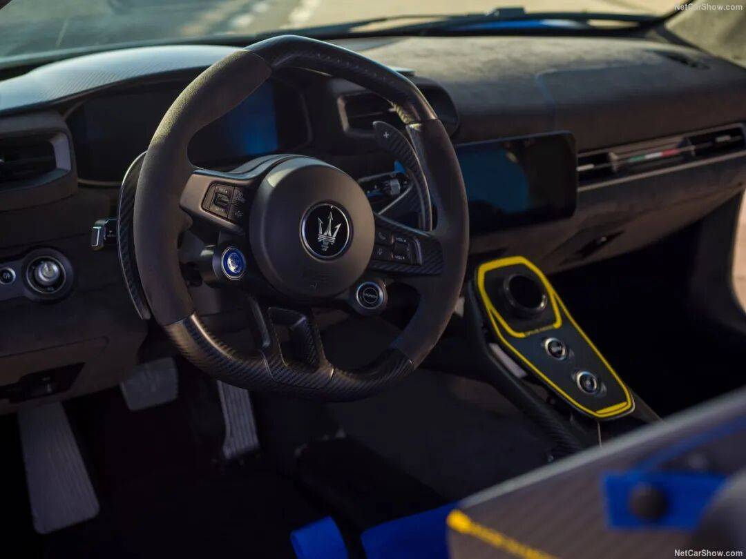 玛莎拉蒂为该车的发动机调校小幅提功,最大功率提升10马力,扭矩则微降10Nm,最终参数为631马力与720Nm,而标准版MC20的参数为621马力与730Nm。传动系统匹配8速双离合变速箱,经专属调校后,运动模式下换挡会产生强烈的顿挫感,带来极致的驾控仪式感。