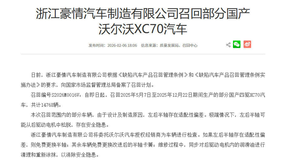 日前,国家市场监督管理总局披露的新一批召回信息,其中显示浙江豪情汽车制造有限公司向国家市场监督管理总局备案了召回计划。召回编号S2026M0016V:自即日起,召回2025年5月7日至2025年12月22日期间生产的部分国产四驱XC70汽车,共计14768辆。
