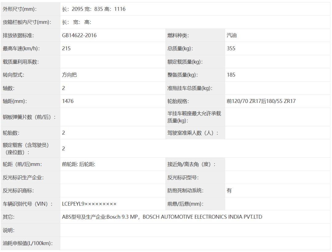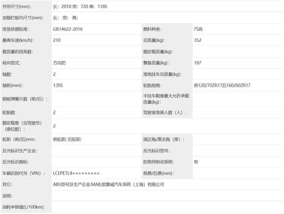 摩博会上凯越预告了会具备弯道ABS、防翘头控制、多段牵引力控制、防翘尾控制、发动机制动、坡道辅助、前后毫米波雷达和定速巡航等配置,在工信部信息上暂时看不到,不知道会不会配备。