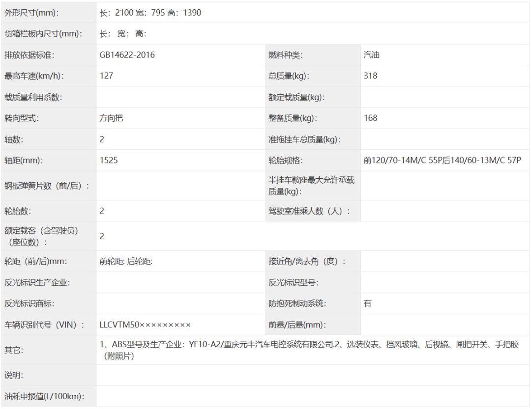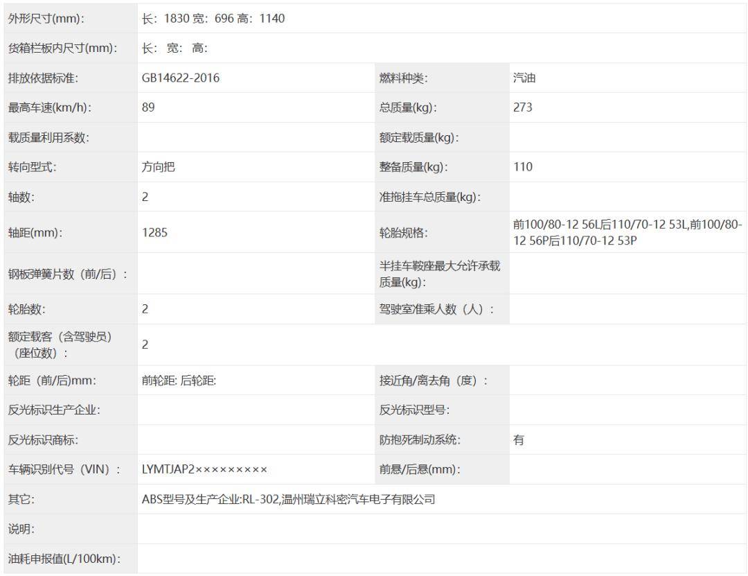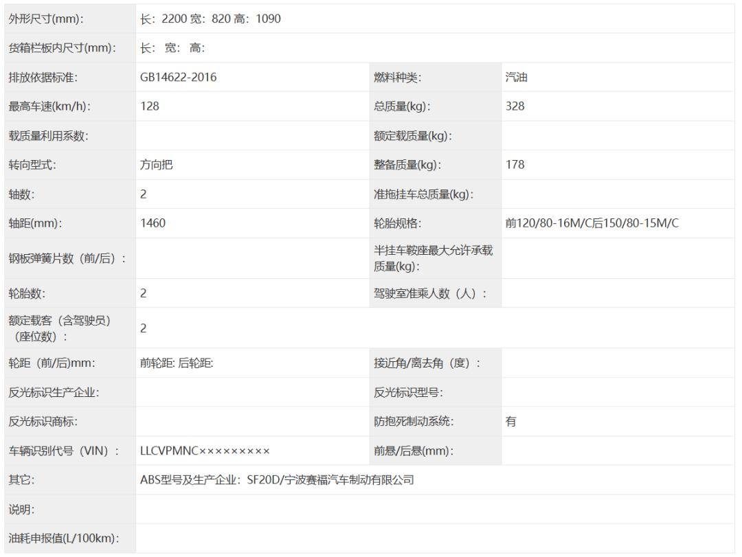 这台车整备质量110公斤,配备了前后12寸轮毂,并且配有ABS,预计前后应该都是碟刹。