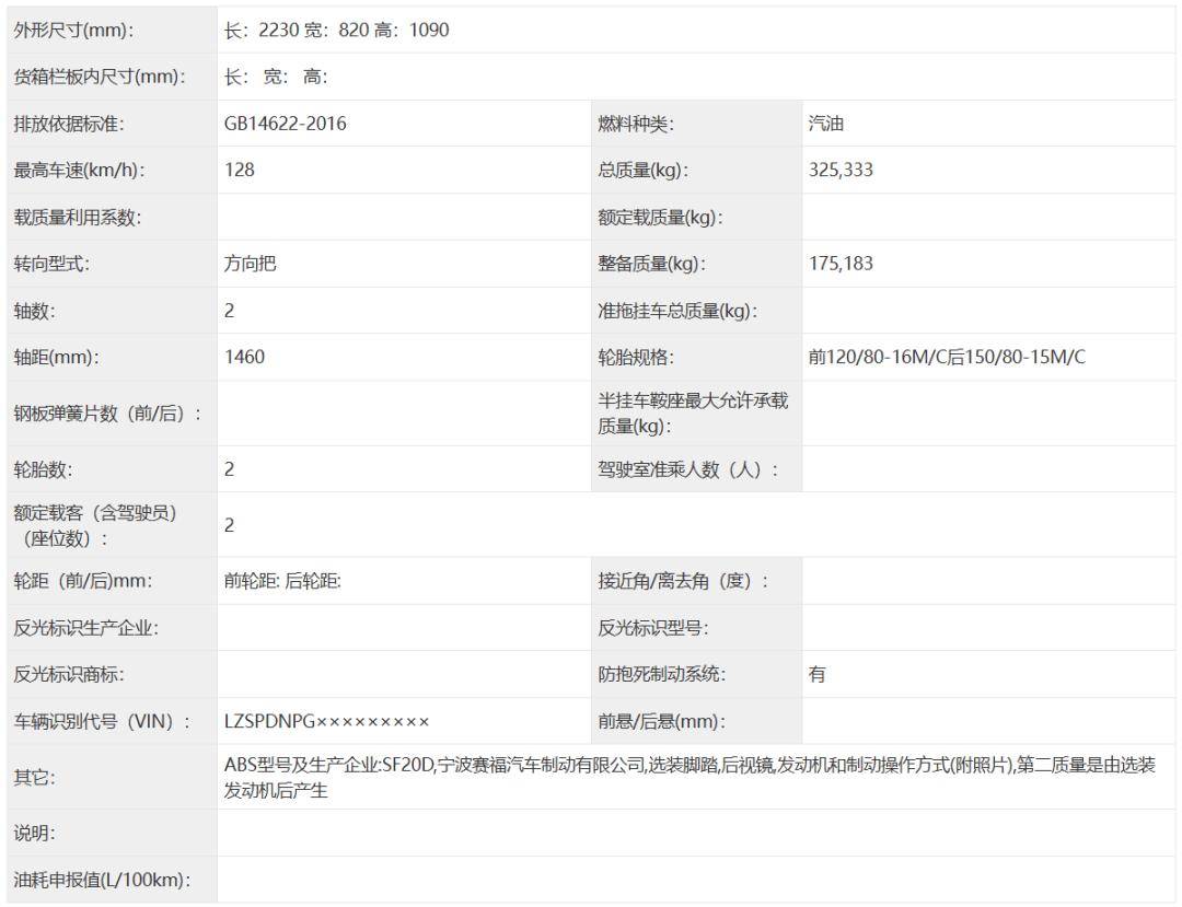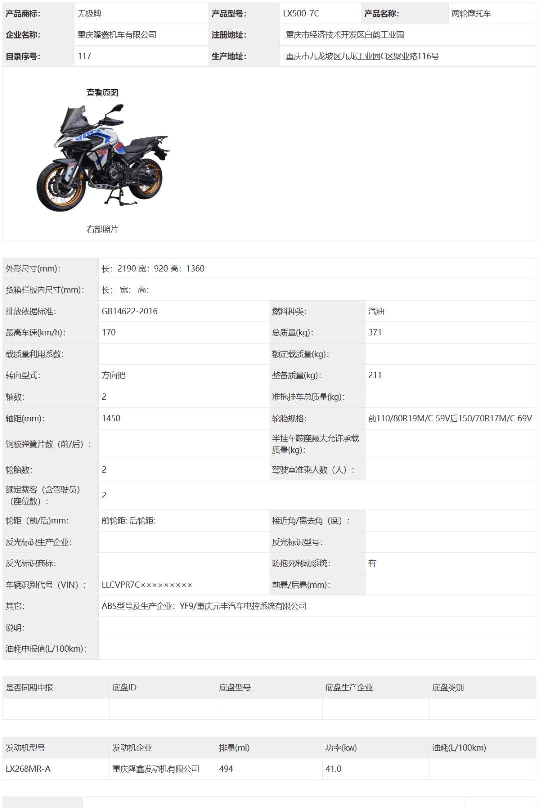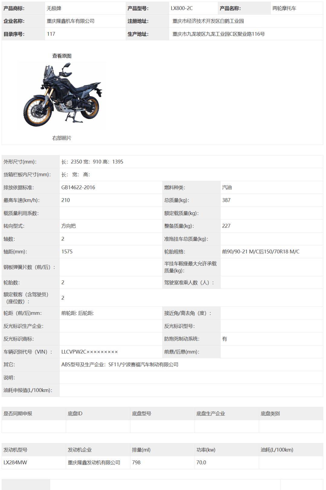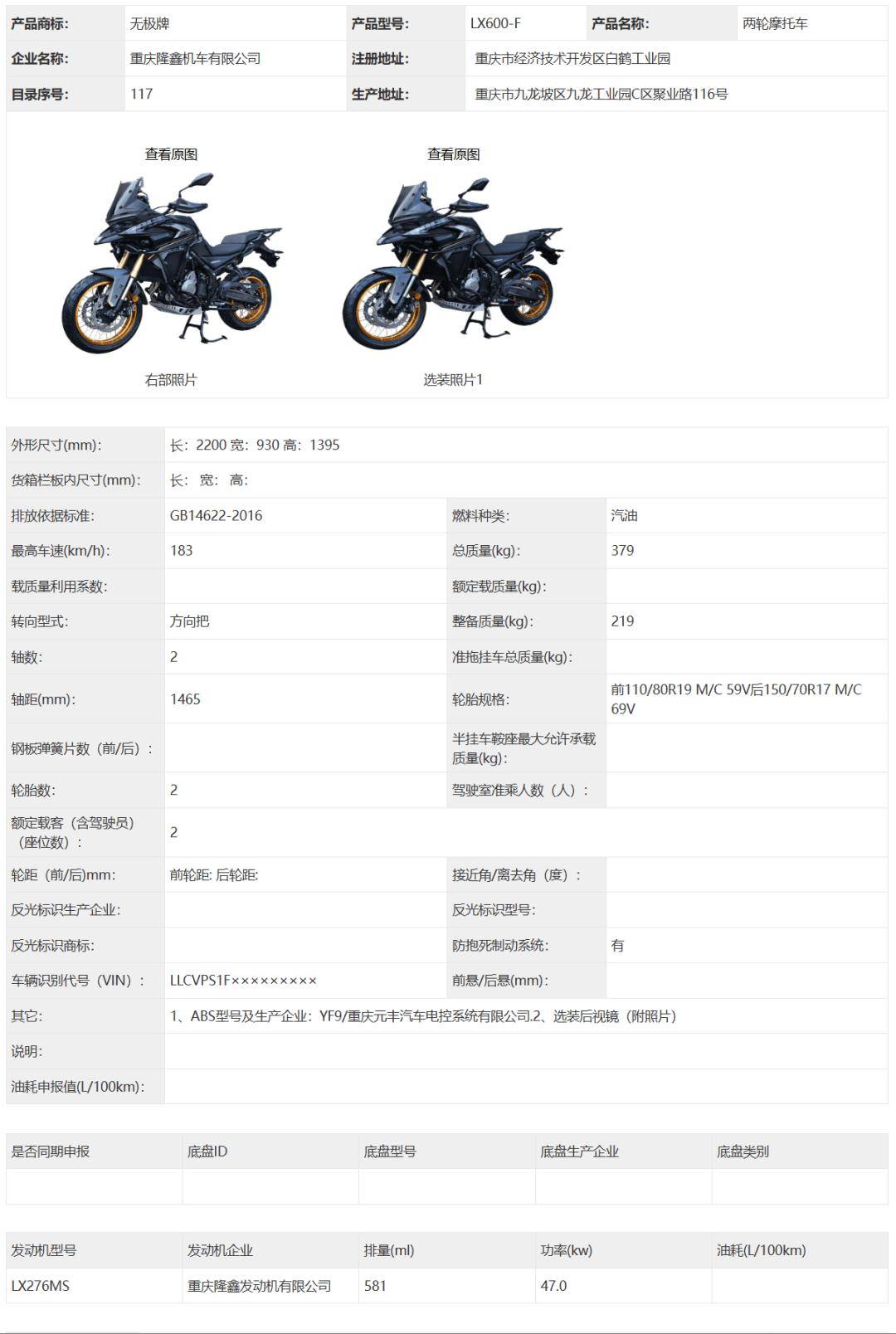 DS625X本次申报了无三箱的电子避震版车型,整备质量为217公斤,其余于变化。