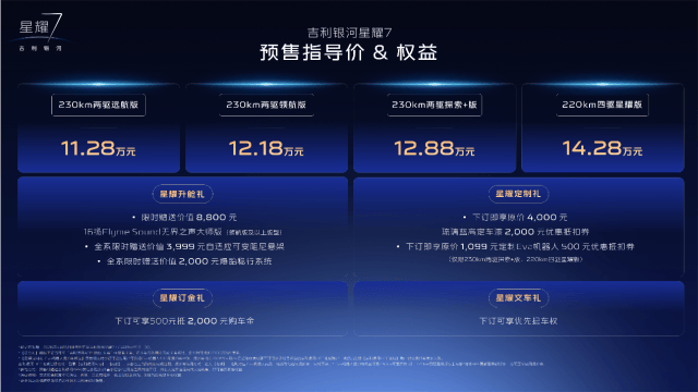 4月16日,吉利银河星耀7正式开启预售。这次一共推出4个版本,分别是220km四驱星耀版、230km两驱探索+版、230km两驱领航版和230km两驱远航版,预售指导价从11.28万元到14.28万元。预售价一出来,基本上就把这款车放在了中级电混轿车市场一个比较有竞争力的位置上。而且吉利银河还同步给出了预售权益,用户交500元订金,能享受到最高18799元的综合权益,包括升舱、定制、订金和交车四重礼。