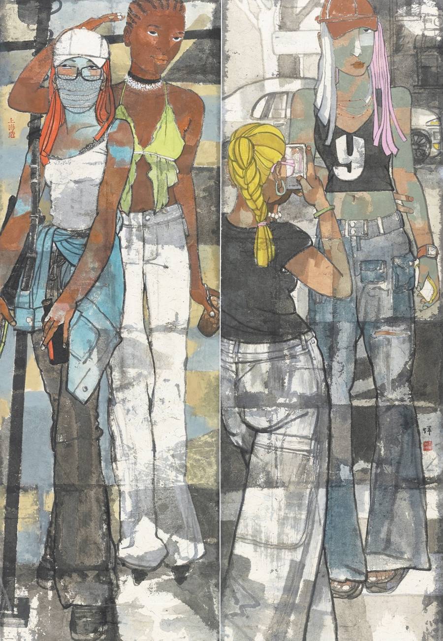 王辉是机构美术老师,他的中国画作品《魔都丽人》捕捉魔都街头活力四射、不同肤色的时尚年轻人风采,力图展现这座城市既是中国的上海,也是世界的上海。创作手法上通过主观的色彩和造型提炼变形处理,试图追求一种视觉上的“陌生感”。这幅作品中,每一笔落纸都是与魔都时尚脉搏的对话,每一抹设色,皆是向深厚海派文脉的致敬。王辉是来自山西的新上海人,来上海9年中的每届江南之春都有参加,“督促我不断作画,持续提升。”家中孩子的个性穿衣风格,在他看来“很能代表这个时代的上海”,使其产生了作这幅画的想法。他用自带的北方来的偏厚重的色彩风格,糅合南方的细腻,并对人物进行了变形处理,使得作品更具有现代感。