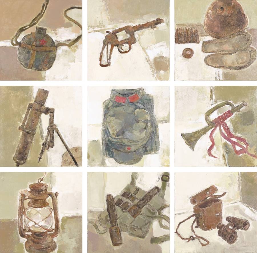 今年是中国人民抗日战争暨世界反法西斯战争胜利80周年,不少作者也在作品中用艺术语言唤醒人们对那段峥嵘岁月的记忆。赵惊树的油画《锈色长歌》以九件红军老物件为载体,搭建过去与当下的情感桥梁。九宫格里既有水壶、军服,也有喇叭、灯、手枪等,这些老物件是具象化的精神图腾,曾伴先辈征战,承载热血信念。粗糙斑驳的肌理,恰似岁月蚀刻的勋章。“我希望通过红军各种不同的物件立体呈现他们工作生活的状况,让现代的人能睹物思人,了解战争的残酷,不忘那段烽火岁月。”为此,在徐汇区文化单位工作的赵惊树屡次去上海市历史博物馆去参观、拍摄老物件,然后进行甄选。水壶和喇叭上的飘带令物件动感起来,成为连接今人和先辈的情感纽带,于锈迹中吟唱不朽长歌。