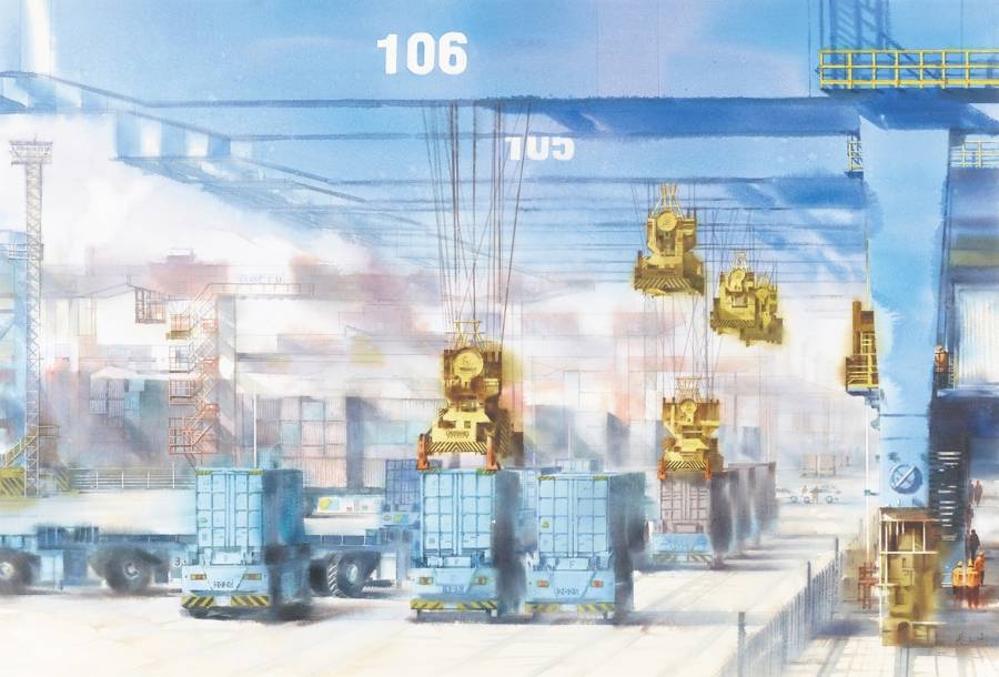 蔡亚鸣的水彩画《大国系列——起航》采用湿画法,在氤氲之美中将繁忙的自动化码头生动地描绘出来。作者蔡亚鸣是上海技术应用大学生态技术与工程专业老师,感受新时代脉搏,他于建党100周年之际开始创作大国系列,这已是该系列的第三幅作品。为了创作,他多次去现场观看港口的运行状况,“我被现场恢宏的工作场景深深感染”。他与码头工作人员、技术人员交流,了解现代化港口的运营过程,感慨现代化建设离不开广大劳动人民的辛勤付出和智慧贡献。画面中鲜少有人,只在画幅的最边处出现少数工作人员,既体现了港口的自动化运行,也将国画的留白体现出来,引人遐想。