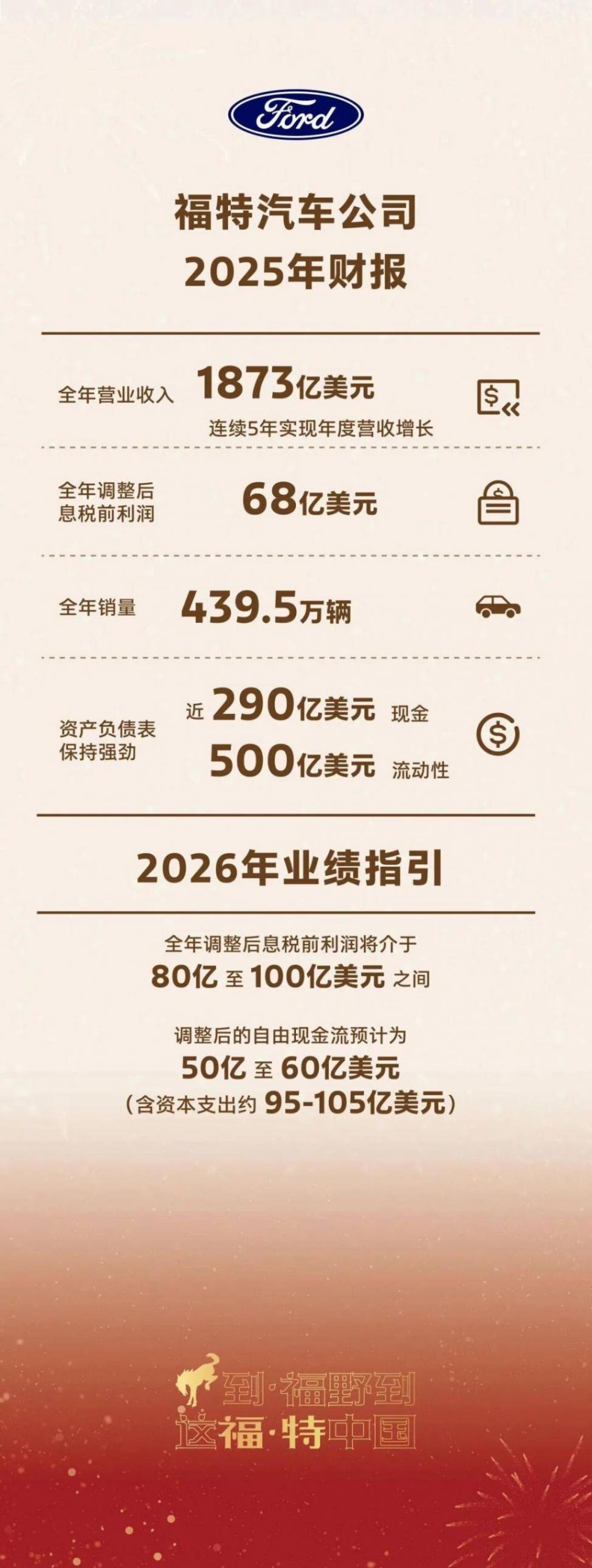 当地时间2月10日,福特汽车发布2025年第四季度及全年财务报告。核心数据显示,2025年,福特汽车营收实现连续五年正增长,展现出一定的经营韧性,但受大额特殊项目费用计提及外部突发成本冲击,全年业绩由盈转亏,三大核心业务板块呈现显著差异化发展态势。