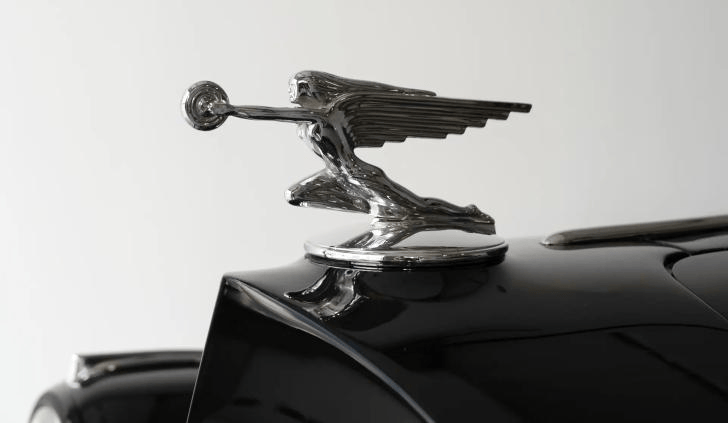 进入咆哮的二十年代((The Roaring Twenties),美国经济繁荣、社会和文化充满活力。爵士时代、好莱坞崛起、装饰艺术(Art Deco)全面席卷,华丽、速度和动感的汽车成为社交身份象征,摩登文化与高级定制(Coachbuilt)双双达到高峰。此时,帕卡德品牌进入成熟风格时期,格栅稳定为高耸的“竖琴”造型,与速度女神立标呼应。这是一个精美的装饰艺术风格雕塑,灵感来源于希腊神话中象征着胜利和速度的女神耐克(Nike),如图4所示,女神呈跪姿,双臂前伸,手中握着圆环,象征轮胎或方向盘,头发和衣物向后飘动,双翼展开,营造出速度、优雅和胜利的动感印象。有意思的是,因圆环看起来像一个甜甜圈,所以也被戏称为“甜甜圈追逐者”(Donut Chaser)。 另一方面,与雷蒙德·迪特里希(Ray Dietrich)与荷兰·达林(Dutch Darrin)等高定设计工作室的合作,打造了多款被富人阶层追捧的车型。如图5所示,作为美国工业豪华的优雅奠基者,迪特里希设计的帕卡德车身线条顺畅,尺度比例优雅,车顶线条更低、更流线,细节精致不夸张。而作为摩登时代的浪漫主义者,达林创造了好莱坞剧场感的“躺式挡风玻璃”设计,即A柱与前门缝线为连贯线条。车身弧线更优雅,腰线收紧,艺术性强。种低调优雅与工程兼具的风格与凯迪拉克的张扬的炫目派形成鲜明对比,使得帕卡德成为美国新兴富豪与政客们财富与品位的标准配置。包括胡佛、罗斯福等多位美国总统选择帕卡德作为总统座驾,确立了其“美国豪华车之王”的形象。