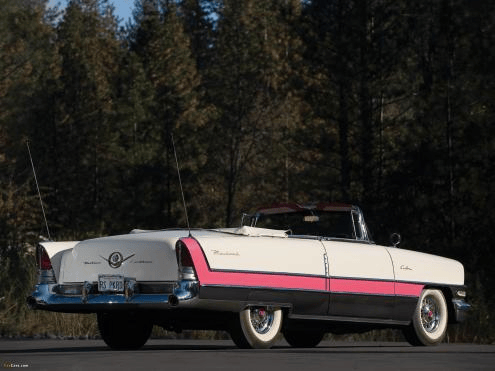 卡帕德推出了Clipper(1946–1947)车型,如图7所示,品牌经典的直立黄金比例格栅变宽变低,虽然迎合了流线、水平化趋势,但失去贵族感。灯具融入了翼子板,削弱了传统豪华的特点,而飞机尾翼,高亮镀铬等动感特征却没有跟上潮流。整车姿态接近水平,缺乏之前的仪式感。所以Clipper偏保守设计被认为是卡帕德的中年危机,即为了迎合了时代,用失去身份的代价换取销量。随后推出的22/23 Series(1948-1950)在设计上遇到了瓶颈,彻底失去了标志性的纵向格栅,姿态也与大众轿车无明显差别,车身流线却少了轻盈的优雅,车体给人厚实重量而非轻盈优雅的艺术雕塑。作为卡帕德战后最后的光辉,Caribbean(1953–1956)格栅采用宽大横条,彻底放弃传统高耸竖条设计,车姿态更低更宽,试图追赶潮流,灯具增大、镀铬增多,车尾增加尾翼设计,更科幻、更浮夸。尤其是采用的三色涂装(如白+粉+蓝)成为时代潮流,被认为代表了50年代美国审美。设计非常漂亮、现代,不过更像别克或者奥兹莫比(Oldsmobile)品牌的车。所以帕卡德滑落到不够新潮,也不够豪华,“过期贵族”的尴尬位置。