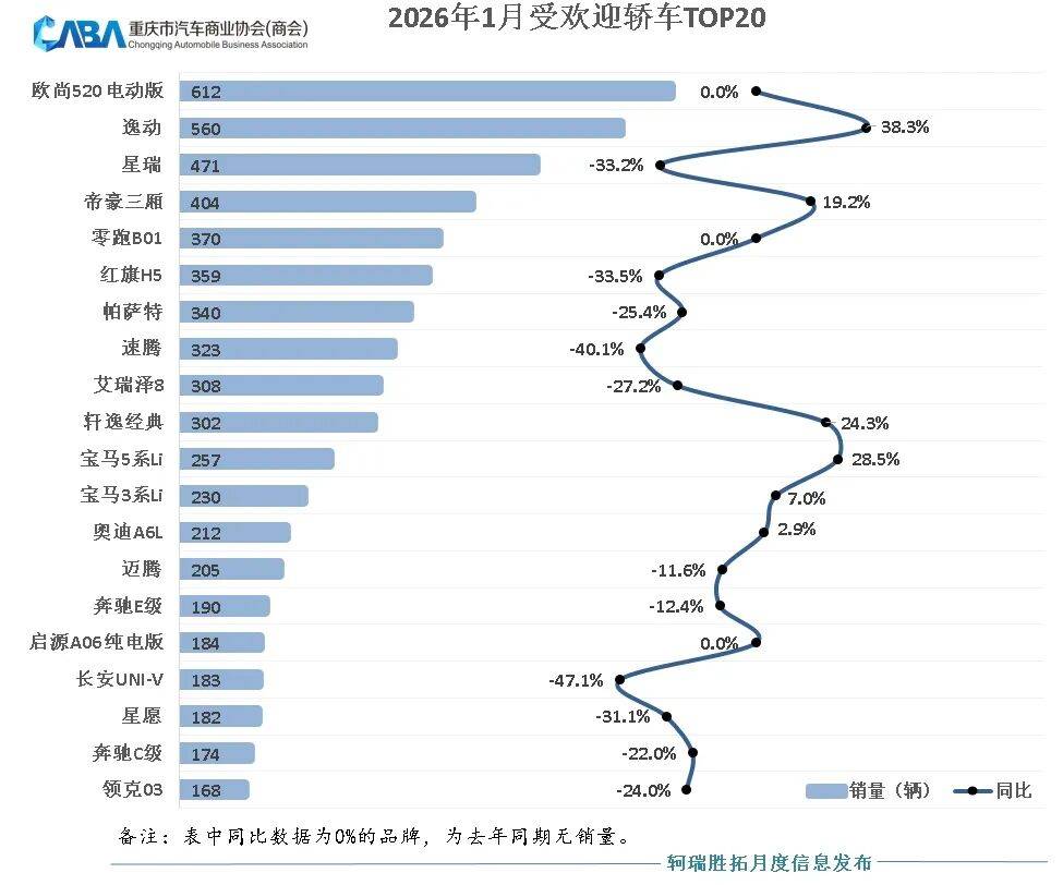 1月份,重庆市场受欢迎轿车TOP20中,欧尚520电动版、、星瑞位居前三,销量分别为612辆、560辆、471辆,自主品牌整体表现亮眼。毫无疑问,欧尚520电动版卖得好,很大程度又接到出租车或网约车大单了,助力该车成为终端市场销冠。
