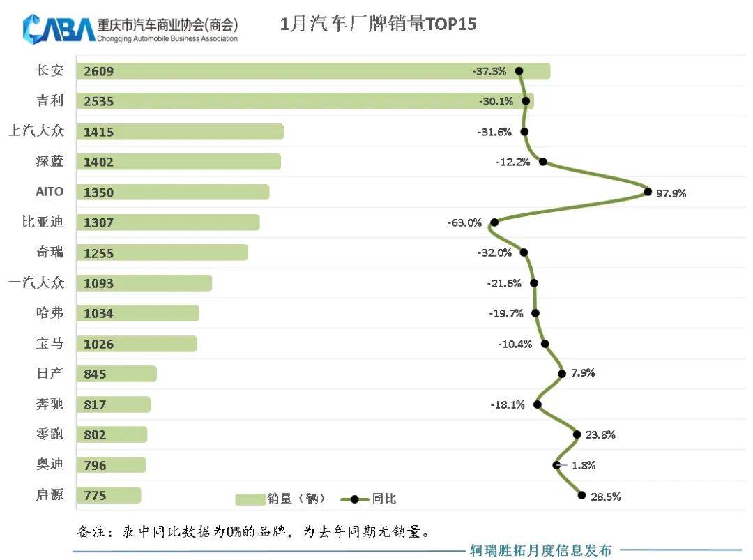 1月份,重庆汽车厂牌销量排名前三为、吉利、上汽大众,销量分别为2609辆、2535辆、1415辆。不过,较之上月增长势头,1月这三家品牌均分别同比下滑37.3%、30.1%、31.6%,整体呈现低迷状态。