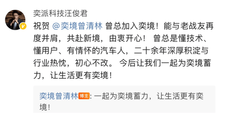 值得注意的是,汪俊君与曾清林在岚图时期已有交集——一个是CTO,一个是销售副总经理,如今再度联手执掌奕境,这种默契绝非凭空而来。汪俊君在曾清林的社交动态下留言“能与老战友再度并肩,共赴新境,由衷开心”,并评价曾清林“懂技术、懂用户、有情怀”,一句“老战友”道出了二人之间积淀已久的信任与协同基础。