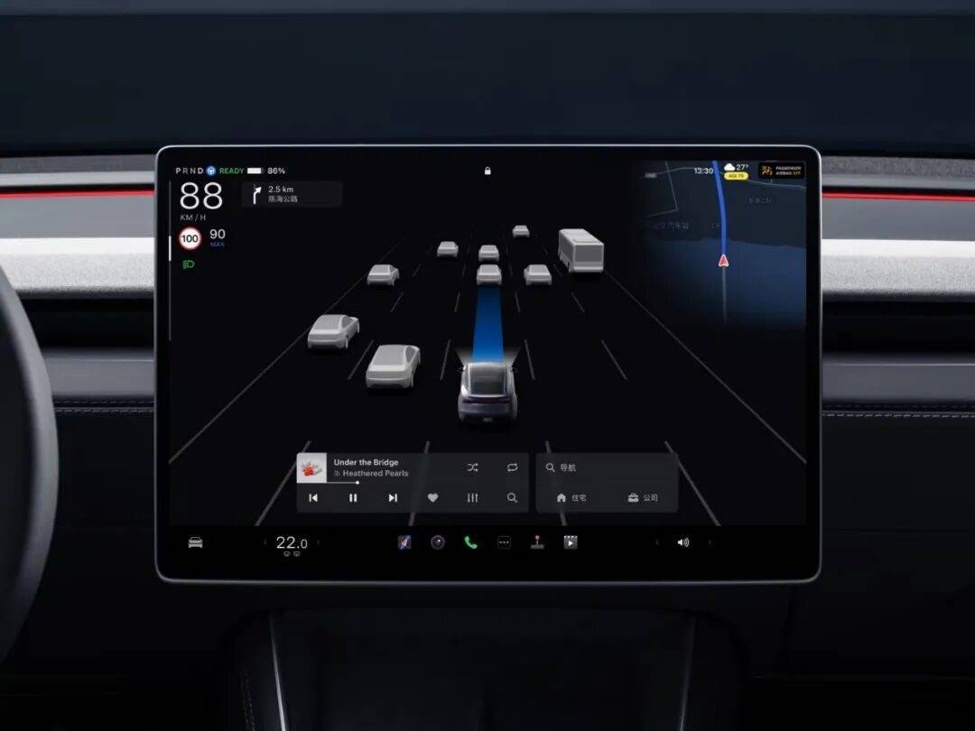 相比之下,2026款Model Y的座舱延续了“减法哲学”。中控屏从14英寸升级到16英寸2K屏,分辨率更高、界面滑动更顺畅。后排还新增了8英寸触控屏,可以独立调节空调和影音系统,解决了老款“后排乘客只能求前排调空调”的一大痛点。车机系统操作逻辑高度收敛,所有功能都集中在中控屏上,上手需要一定学习成本。