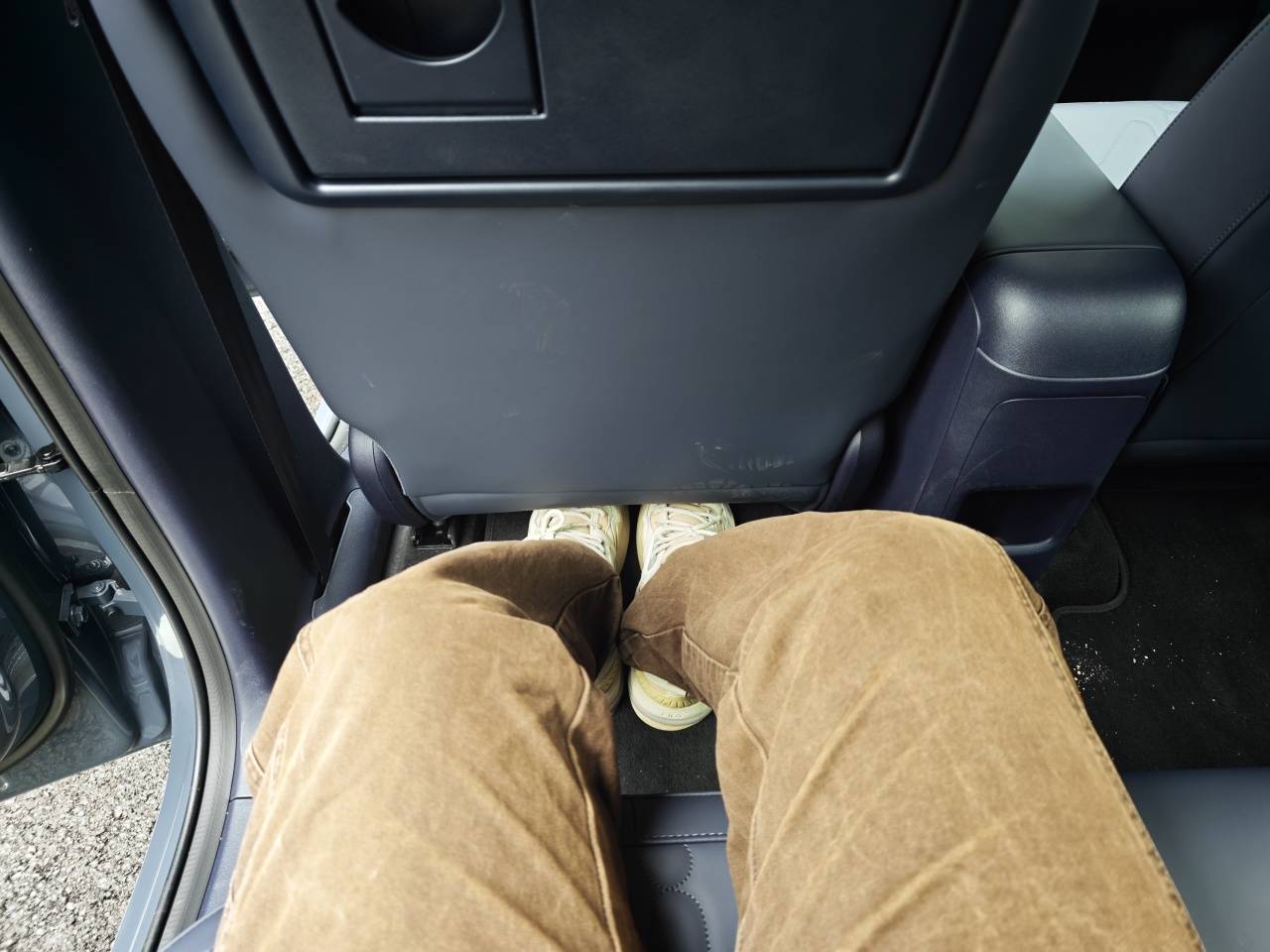 调整到合适的前排驾驶坐姿后,我坐进后排,此时腿部空间为2拳4指,头部空间为1拳,非常宽敞。坐姿也比较正常,坐垫填充物软硬适中,面料比较滑,是一种环保的亲肤材质,获得了环保认证,因此宣传内舱是零甲醛释放,母婴友好;靠背角度略直,但作为一台代步车可以接受,坐着不难受,我个人觉得比B10的后排更舒服,还多了后排阅读灯,绝对好评。座垫长度对我的腿长来说刚刚好,但如果身高超过175cm的话,可能会觉得略有点短。