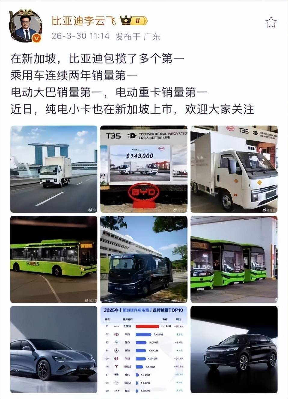 3月底,为新加坡市场量身定制的纯电小卡T35正式上市,售价约14.3万新币。而就在刚刚结束的3月份,比亚迪乘用车销量突破30万,其中海外销售接近12万辆,同比增长65.2%。