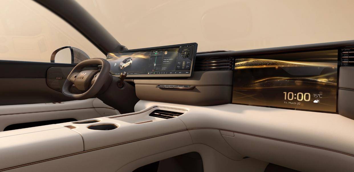 车内采用超宽体环抱式布局,大面积Nappa真皮和Alcantara覆盖,提供三款内饰配色。27.1英寸5K MiniLED驾舱屏和15.6英寸3K副驾娱乐屏是前排视觉重心,六座版二排还有21.5英寸4K吸顶屏,三屏交互形成了不错的沉浸感。25扬声器B&O音响(7.1.4声道)、12.3L双开门冷暖冰箱、4D机械按摩座椅、智控地暖系统等配置拉满,如果放在豪华品牌上,这些选装项加起来少说要加好几万。