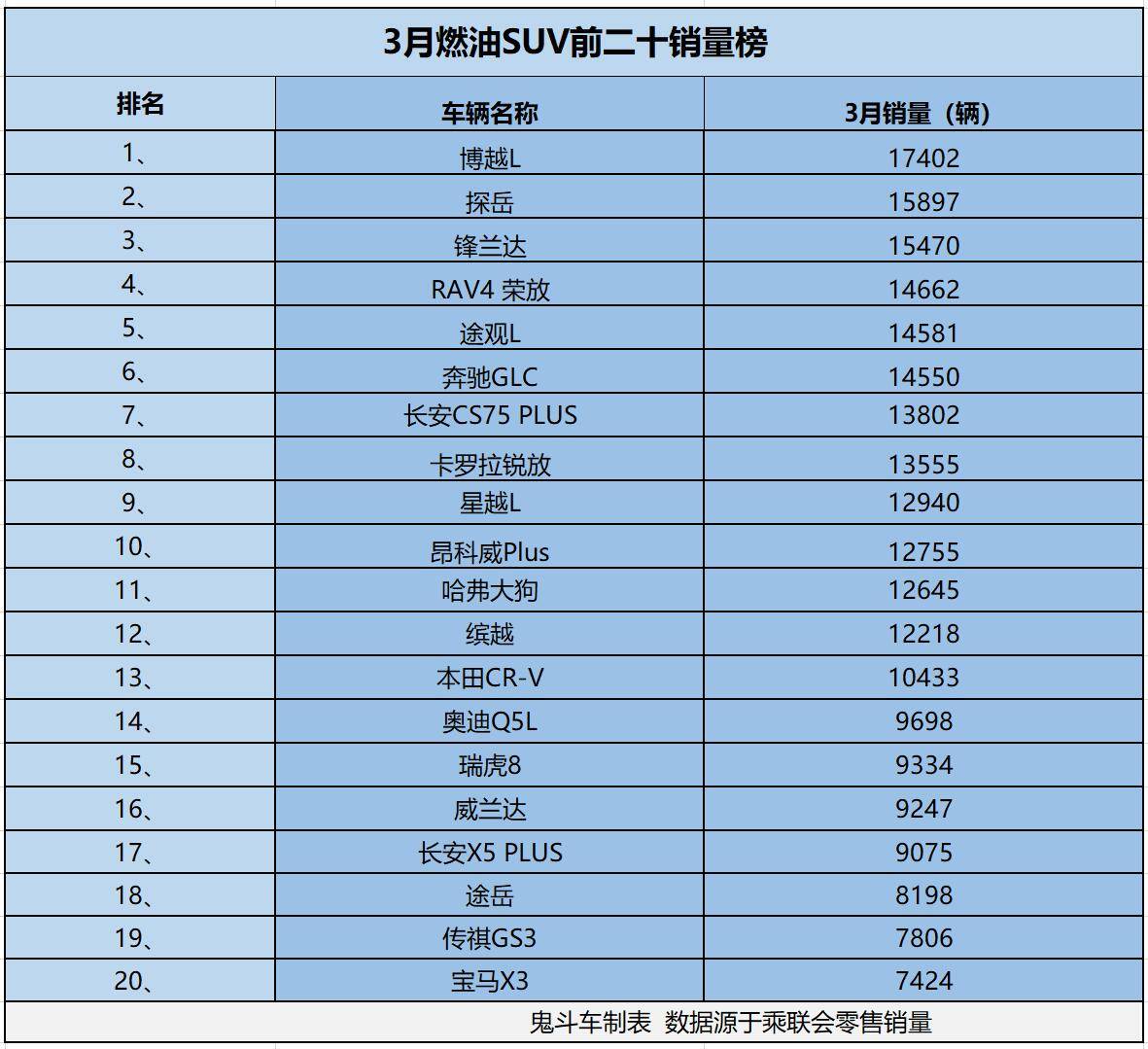 日前,乘联会发布3月零售销量数据,这一期,我们先聊一下3月燃油SUV前二十销量榜单,数据源自乘联会销量数据。从榜单上看到,共有13款燃油SUV销量过万,整体销量表现并没有那么糟,热销车型并不算少。接下来,再看看车型具体排名与销量。