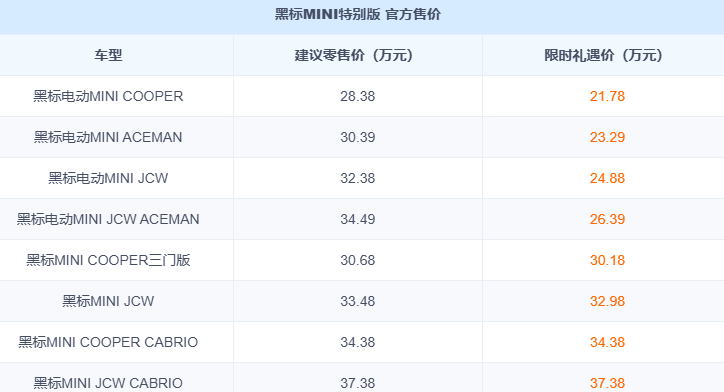 近日,黑标MINI特别版正式上市,一共推出8款车型,覆盖燃油、纯电、JCW性能版与敞篷版本,官方指导价28.38-37.38万,限时特惠价21.78万起,优惠活动仅持续到4月30日。