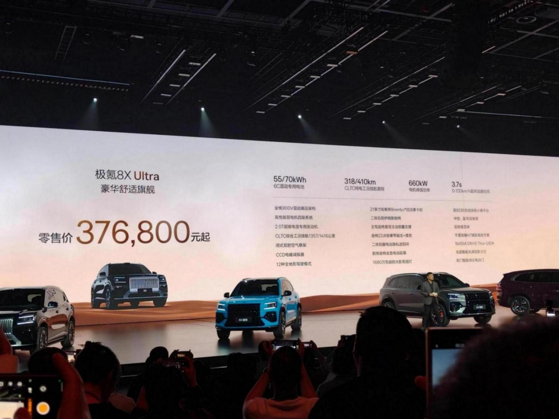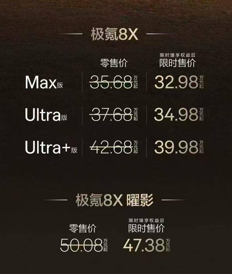 极氪8X定价公布那一刻,现场爆发出一阵欢呼。新车共推出Max、Ultra、Ultra+三个版型,官方零售价分别为35.68万、37.68万和42.68万;权益后限时售价32.98万、34.98万、39.98万,全系打入40万以内。此外,作为高性能版本的极氪8X曜影版同步上市,权益后限时售价47.38万。
