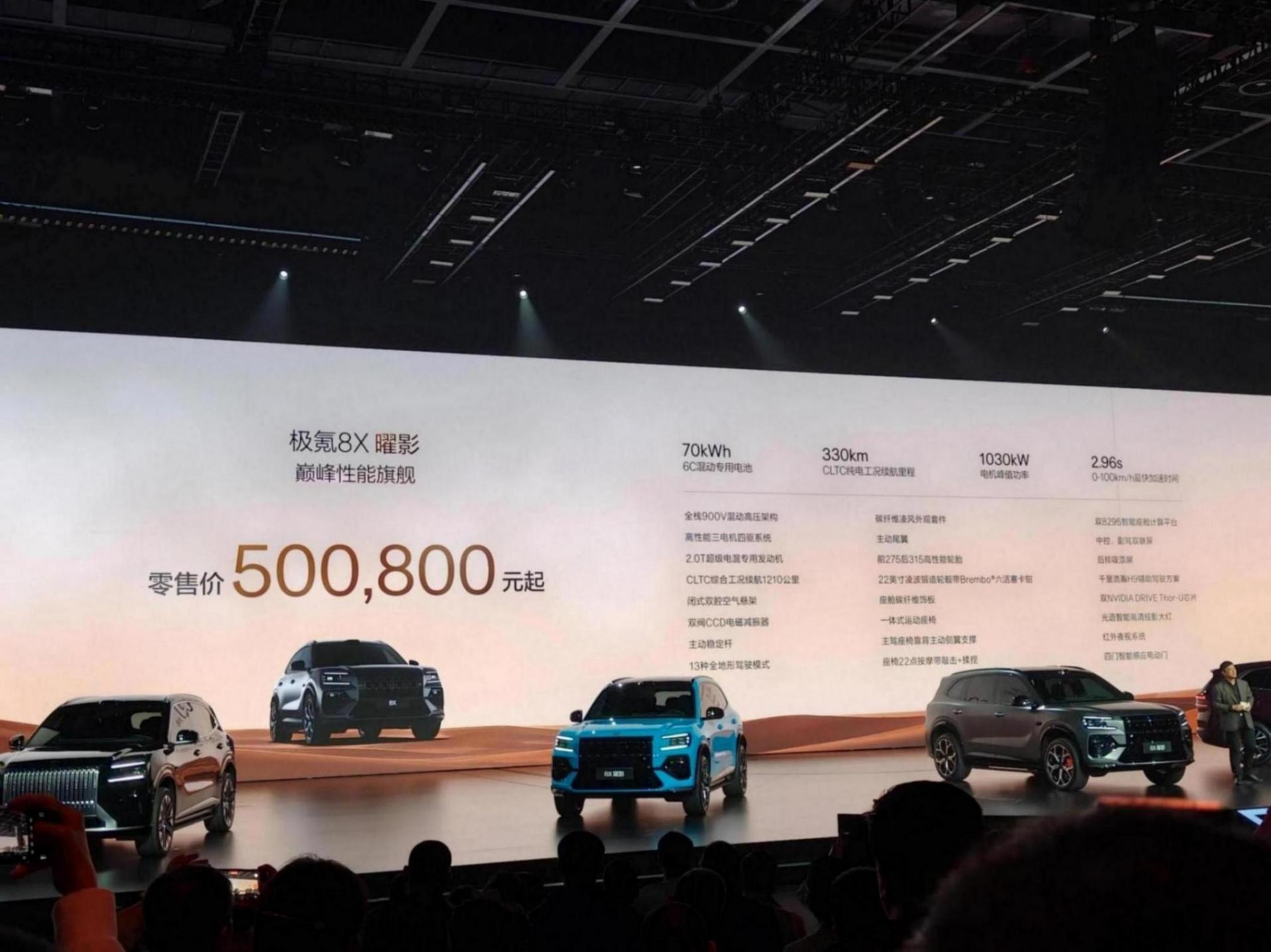 至于极氪8X曜影版,除了更激进的外观套件、黑橙专属内饰、碳纤维套件以及同级唯一主动尾翼外,还搭载三电机,最大马力超千匹,配合同级唯一315宽胎,零百加速2.96秒,性能更强,但这个价格已可以考虑极氪9X了。