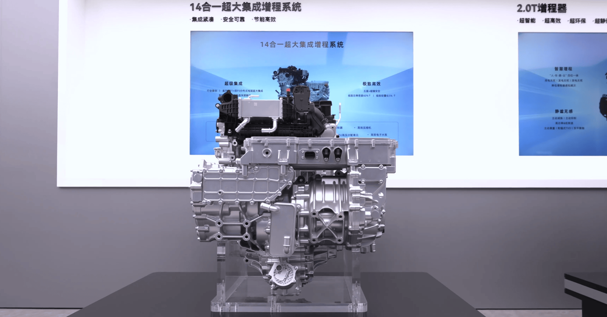 特别值得关注的是,赛力斯还展示了一个14合一超大集成增程系统,这套系统把上面的2.0T増程器、驱动电机和双驱动电机做了集成。从现场展示的产品可以看出,2.0T增程器与双电机以及发电机完全整合在一起,整体尺寸相当可观,这表明该系统是专为更大尺寸车型而设计,估计会是问界旗舰车型的动力系统。