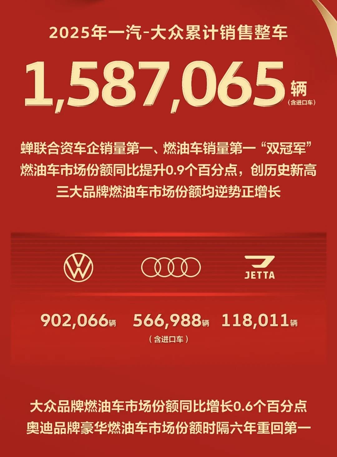 当2025年中国车市正式迈入“新能源主导”新阶段,54%的新能源渗透率让燃油车市场遭遇前所未有的挤压,自主品牌65%的市占率更是将合资阵营逼至“存量博弈”的悬崖边。就在这样的行业变局中,一汽-大众以158.7万辆的全年销量、“合资车企销量第一”“燃油车销量第一”的双冠成绩,交出了一份逆势增长的答卷。其燃油车市场份额同比提升0.9个百分点,奥迪品牌时隔六年重回豪华燃油车市场榜首,第3000万辆整车下线的里程碑,不仅是企业三十年深耕的见证,更成为合资车企在产业变革中寻找“中国答案”的生动样本。