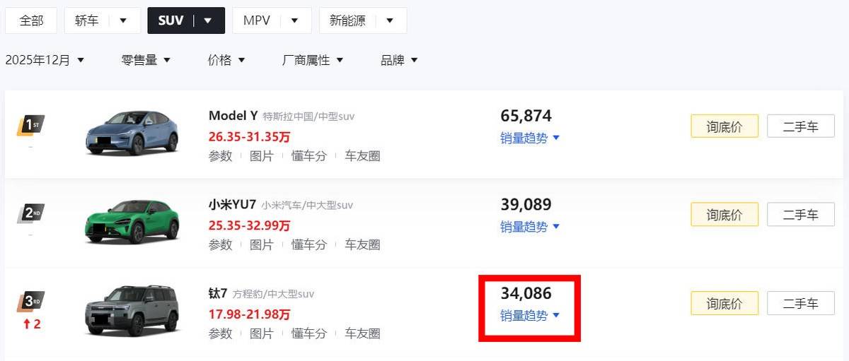 方程豹钛7作为2025年热度最高的方盒子SUV,在终端的销量表现也非常不错。就拿去年12月份来说,其便一口气卖出去了34086辆新车,排在整个SUV销量总榜的第三名,可见消费者对它的喜爱和认可度之高。
