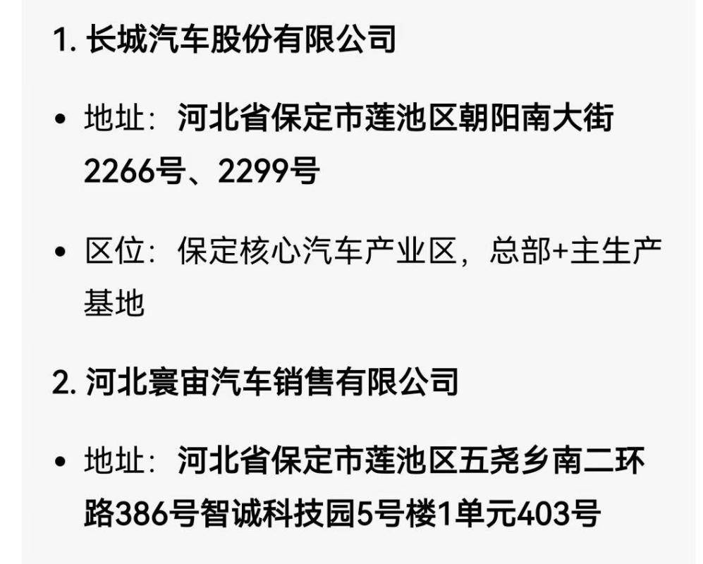 随着网友进一步的深挖,一个更明显的“巧合”浮出水面:长城汽车的总部位于河北省保定市莲池区朝阳南大街,而河北寰宙汽车销售有限公司的注册地,同样位于河北省保定市莲池区五尧乡。“都在同一个区,距离不远,很难不让人联想这两家公司是不是‘邻居变伙伴’。”有网友评论道。