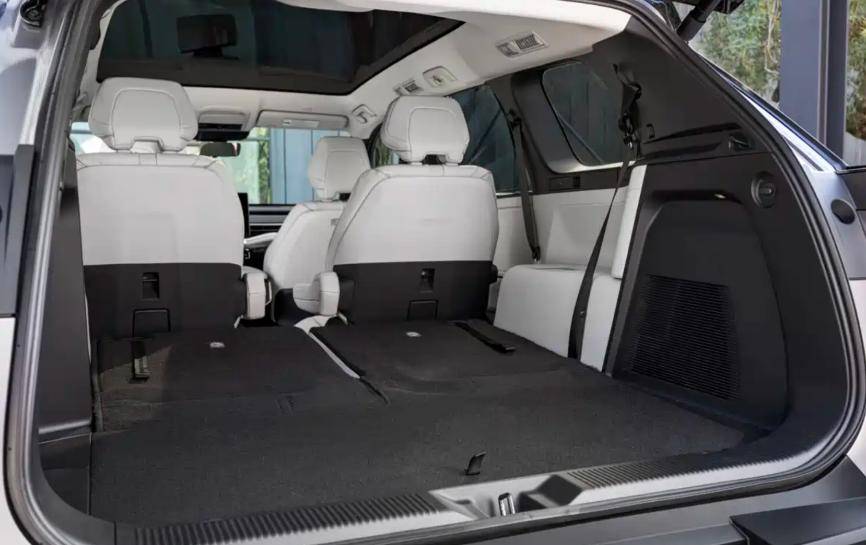 从实车图片可以看到,纯电版汉兰达采用了2+2+2的6座布局,第二排是两个带扶手的独立座椅,中间有过道。第三排座椅放倒后可与后备箱齐平,拓展的空间超过1274L。