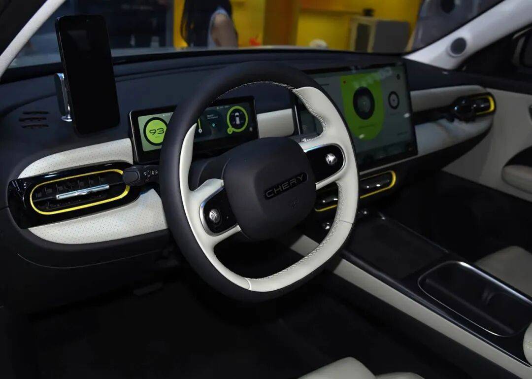 打开车门,黑色+白色双拼色,再配合空调出风口等细节处的亮黄色元素点缀,显得非常有精致感。双辐式多功能方向盘、全液晶仪表、大尺寸悬浮式中控屏等,科技感也比较到位。
