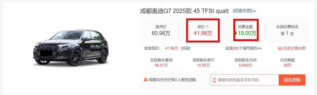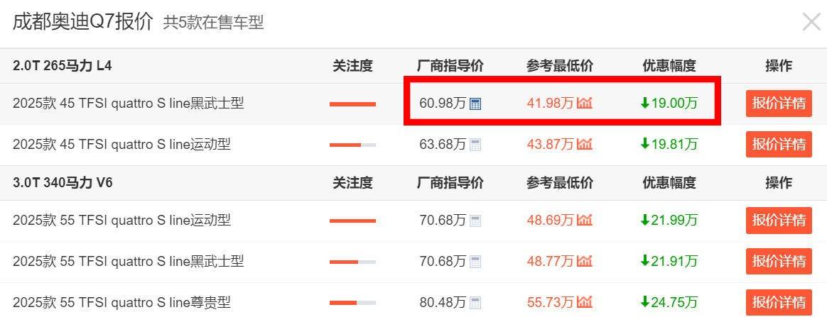 同样40多万的预算,如果是让我去买一台大尺寸的SUV,那我可能真不会去买像理想L9、蔚来ES8这样的新能源车型。为啥这么说呢?因为现在纯进口的奥迪Q7眼下在终端的最低价格,也已经只需42万就能买了。